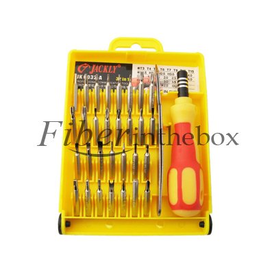 Fiberinthebox provides various types of optical fiber tools which are very impo ant in the optical fiber installation and maintenance works. There are fiber cable stripper, fiber cable slitter, crimping tool, optical fiber cutter, punch down tool, network pliers and so on. And we also provide some other optical fiber related tools, if you need or have some questions of this Jackly 32 in 1 Interchangeable Precise Manual Tool Set, welcome to contact us for more details.